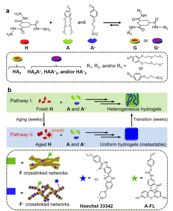 在该研究工作中,该团队发展了一种独特的、利用分子老化诱导成核组装的控制手段,实现了具有瞬态特性的超分子水凝胶材料的制备。研究人员在一前期构筑的模块化超分子组装体系(Angew.Chem. Int.Ed. 2019, 58,3800; J. Am. Chem. Soc. 2019, 141, 2847)基础上,发现通过对模块分子进行温和的老化处理,即可诱导改变后续分子的组装路径,由自发条件下的亲热力学控制转变为亲动力学控制,组装形成一种独特的亚稳态超分子水凝胶材料。进一步研究发现,体系中的组装前体分子在老化处理过程中,自组装成纳米级的聚集体,该聚集体作为成核中心,改变了分子组装成核过程,诱导组装过程转变为亲动力学控制型,最终形成动力学控制的超分子组装产物。该超分子凝胶表现出独特的瞬态特性,其结构随时间可进行缓慢的演变,最终转变为相对稳定的凝胶状态。
