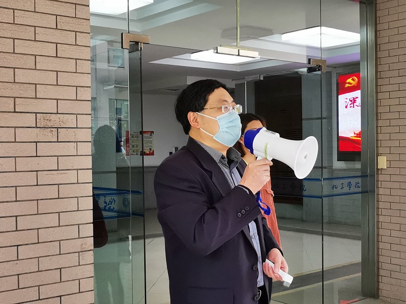 朱学栋作动员讲话,他指出,新冠肺炎疫情发生以来,在以习近平同志为核心的党中央坚强领导下,全国人民众志成城、顽强拼搏,打响了新冠肺炎疫情防控的人民战争。经过三个月的艰苦奋战,全国疫情防控形势持续向好,经济社会运行秩序正在快速恢复。在习近平总书记高瞻远瞩的战略决策下彰显了中国力量、中国效率和中国速度,赢得国际社会的广泛赞誉和敬佩。随着疫情得到控制,我们复工复学已经进入日程,如何提高应对疫情的应急反应处置能力,严防疫情在学院传播与扩散,确保师生身体健康和生命安全显得十分重要,需要我们每一位的努力。本次学院开展疫情防控演练,主要任务是是通过演练提升学院疫情工作预案的科学性,确保师生返校后校园生活平稳有序。