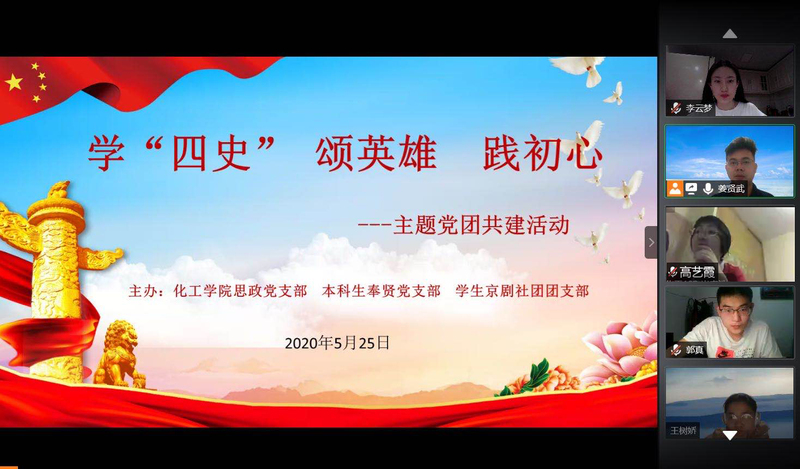 5月25日,化工学院思政党支部、本科生奉贤党支部、学生京剧社团团支部共同举办“学‘四史’、颂英雄、践初心”的线上主题党团共建活动,以党建带团建,绽放青春力量。化工学院党委副书记高艺霞出席,各年级辅导员、学生党员、发展对象、入党积极分子、京剧社及学生京剧社团团支部的成员共150余人参加了活动。