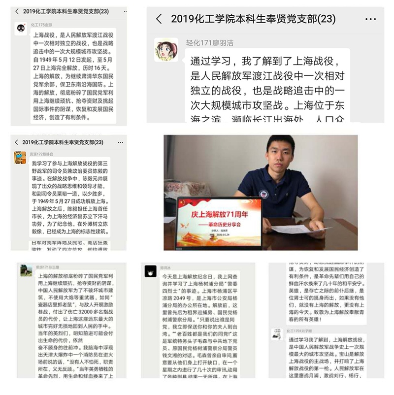 据悉,化工学院不断创新党员教育的形式。结合纪念上海解放71周年,通过对上海革命历史、上海红色地标、上海城市精神大学习、大讨论,制作微党课,学思悟践,在实践中有机融入中华优秀传统文化,更好地发挥美育的育人功能,不忘初心,贯彻落实“四史”的学习教育。