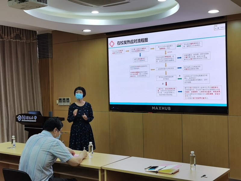 会上,全体人员学习观看华东理工大学新冠肺炎疫情防控视频指南,认真学习学校关于疫情防控的相关规定,提升疫情防控应急处理能力。学院党委副书记高艺霞解读《化工学院疫情期间应急方案》,仔细讲解了在校学生发热的应急流程和相关在校的管理规定。
