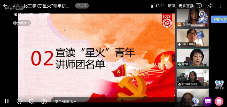 马克思主义学院党委副书记、副院长、星火社指导教师邱卫东,化工学院党委副书记高艺霞出席会议,全体辅导员、“星火”青年讲师团成员、全体学生党员、入党积极分子以及团员青年通过腾讯会议、化工青年集结地站直播平台参加活动。本次活动由星火社社长蔡静宜主持,直播人气达3000余人次。