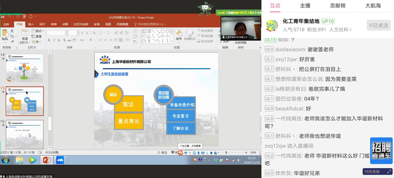 10月19日下午,化工学院2021届毕业生就业动员会在线上召开,以帮助应届毕业生认清当前就业形势,确保就业大局稳定。华谊新材料人事经理瞿红、校就业指导中心副主任盖钧超、2020届硕士毕业生马翀玮、2020届本科毕业生杨鑫鑫应邀出席,参加会议的还有学院就业辅导员于靖和周夏青。会议通过B站平台在线直播,学院800余名本研毕业生实时收看,直播人气更是高达5700余人次。