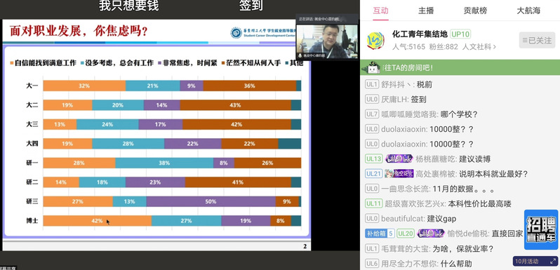 盖钧超分析了2021年就业形势,新冠肺炎疫情的暴发、国际形势的变化严重影响了就业环境,但2020届化工学院毕业生签约薪资却逆势提升。同时,盖钧超分享了自己多年来在就业工作中积累总结的对于职业发展、面试技巧等方面的宝贵经验。直播间气氛热烈,同学们纷纷表示受益匪浅。