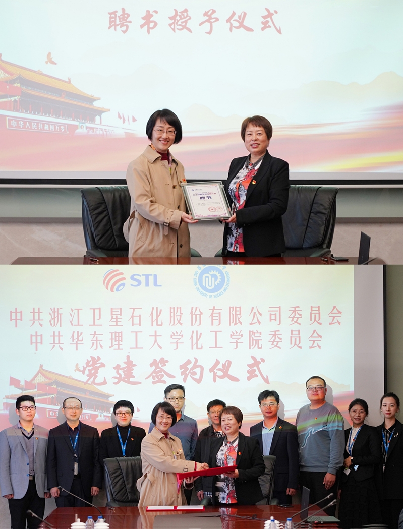 在签约仪式和聘书授予仪式上,化工学院党委与卫星石化股份有限公司委员会签订党建合作协议,同时聘请杨玉英作为学院企业导师。双方将按照“优势互补、共谋发展”的原则,展开多渠道、多层次、多形式交流与合作。双方一致认为,建立党建合作关系将会为学生实习就业、企业人才招聘产生积极的促进作用,并将不断拓展院企合作新空间。