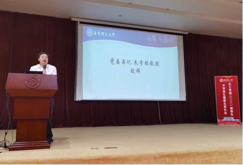 朱学栋代表学校向2021级化工学院新生表示热烈地欢迎,并寄予殷切的希望:希望同学们树立理想,坚定信念,做有梦敢追的“化工人”,独立思考、勇于创新,做开拓进取的“化工人”,要知行合一,内外兼修,做德智体美劳全面发展的“化工人”,立德立言,无问西东。