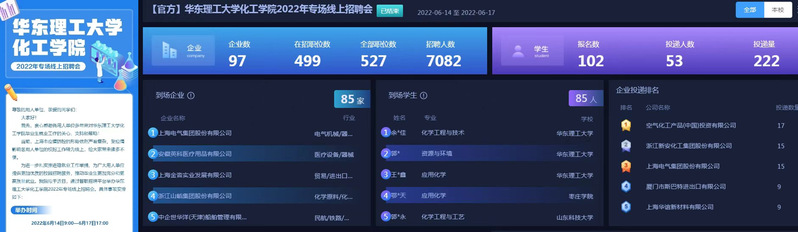 拓渠道,积极对接用人单位,保障就业信息畅通。为了将疫情对毕业生求职择业的不利影响降至最低,化工学院加强与用人单位联系频次,争取就业岗位。学院于6月14日至17日连续4天开展“化工学院2022年专场线上招聘会”,经过审查97家单位参与招聘,实现了就业招聘的空中宣讲、即时互动和视频面试。同时,学院充分整合“华理就业领航号”以及教师、校友推荐的岗位资源进行有针对性的推送,确保就业信息传递畅通。疫情期间,学院累计推送就业信息500余次,提供岗位超过2000个,125名学生顺利完成线上签约。此外,学院进一步深化校企合作,积极参与“访企拓岗”专项行动,切实加强与重点单位重点沟通合作,拓宽毕业生就业渠道。