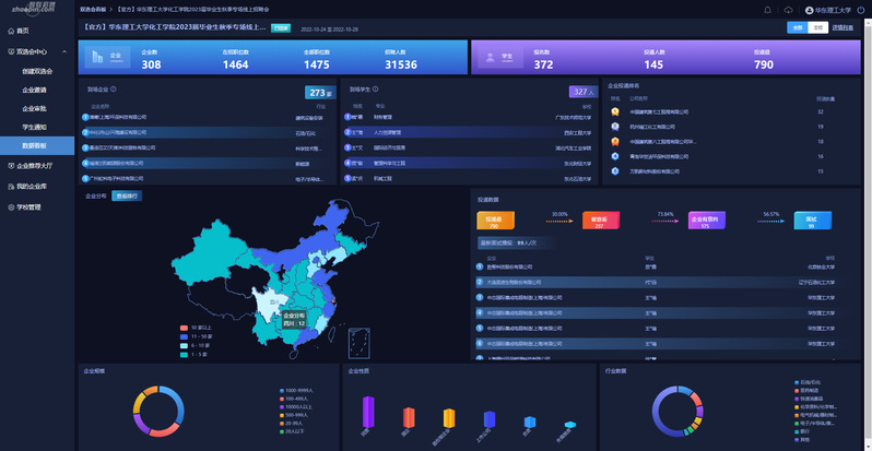 搭建校企桥梁,优化招聘服务。10月24日至28日,化工学院举办“2023届毕业生秋季专场线上招聘会”,实现了就业招聘的空中宣讲、即时互动和视频面试。活动期间,共有308家用人单位通过审查参与招聘,提供了1464个优质岗位,372名学生报名参加,累计共投出790份求职简历。截至招聘会结束,已有102名学生顺利通过面试。此外,化工学院充分整合教育部“24365”校园招聘平台、上海市学生事务中心、“华理就业领航号”、兄弟院校、专业教师、校友单位推荐的岗位资源进行精准推送,确保就业信息传递畅通。