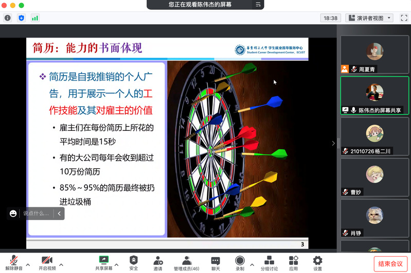 聚焦就业难点,培养求职能力。10月21日,学院启动“就业直通车”系列活动,从毕业生的实际需求出发,持续开展就业指导服务。校就业指导中心陈伟杰应邀开展简历专题培训,从格式简约、重点突出和内容匹配3个方面作了讲解,指导同学们简历撰写的方法和内容,以更准确地展现个人能力和素养。化工学院就业辅导员于靖、周夏青通过线上线下结合的方式,开展“一对一”简历修改、面试指导,针对就业疑难问题进行答疑释惑,助力同学们找到满意工作。目前,已累计“一对一”辅导60余人次。后续,学院还将开展生涯规“化”、求职“工”略主题就业育人活动,引导学生树立正确的职业观、就业观和择业观。