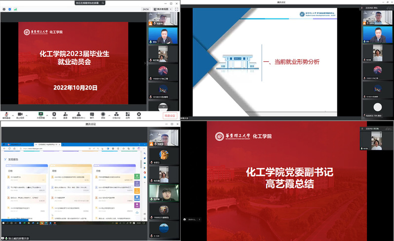 分析就业形势,指导生涯规划。10月20日,学院通过腾讯会议召开毕业生就业工作动员会,激发毕业生就业热情,推进2023届就业工作。学工部副部长、校就业指导中心主任郑东应邀出席,分析了当前就业形势以及往年毕业生的就业去向和薪酬结构,建议同学们尽早确定职业目标,提升求职能力,拒绝体验式考研。2022届校友陈云峰从职业选择、简历制作、面试技巧等方面分享了他的求职经验,帮助同学们树立求职自信。化工学院党委副书记高艺霞鼓励同学们脚踏实地、做两手准备,审时度势、认清市场明确定位,抓住机遇、运用好校院两级的就业平台。会后,同学们纷纷表示获益匪浅,对将来有了更科学的规划。活动当日,新增76人加入就业行列。